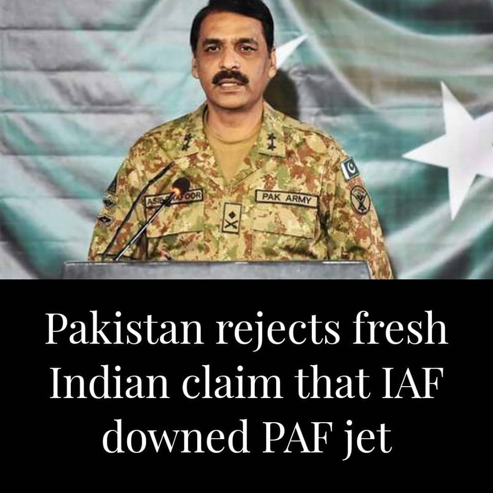 The director general of ISPR, the public affairs wing of the military, was responding to a news conference held by the Indian air chief earlier in the day in New Delhi, where Air Vice Marshal R.G.K Kapoor presented “irrefutable evidence” that they had downed a Pakistani fighter jet in February.