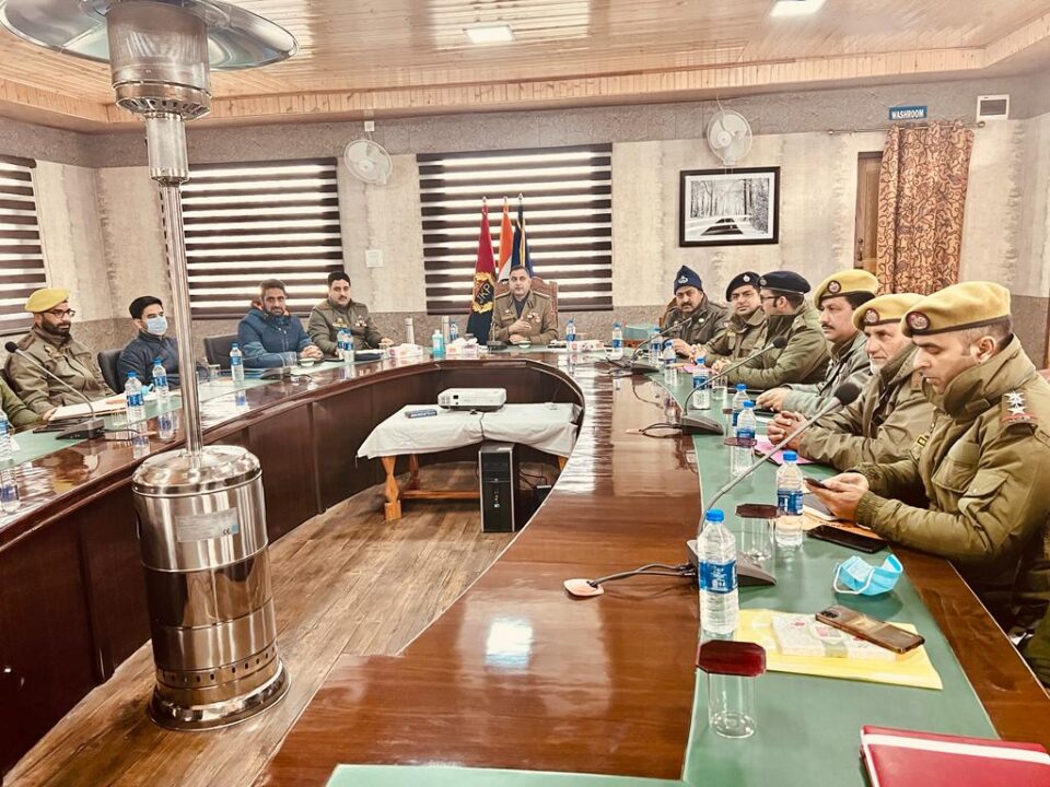 The meeting was attended by ASP Bandipora Shri Ashiq Hussain Tak-JKPS, Sr. PO DPO Bandipora, all SDPO’s/DYSP DAR, all SHOs/ IC PPs of district Bandipora. During the meeting discussion was held on the status of Case FIRs registered in 2021, backlog cases & their disposal, especially cases related to terrorism & narcotics. The overall security scenario of the district was discussed with jurisdictional police officers. The participating officers presented PowerPoint presentations regarding crime and security scenario of their respective jurisdictions. SSP Bandipora also reviewed the progress of actions taken against OGW networks of terrorist organisations operating in jurisdiction of district Bandipora.