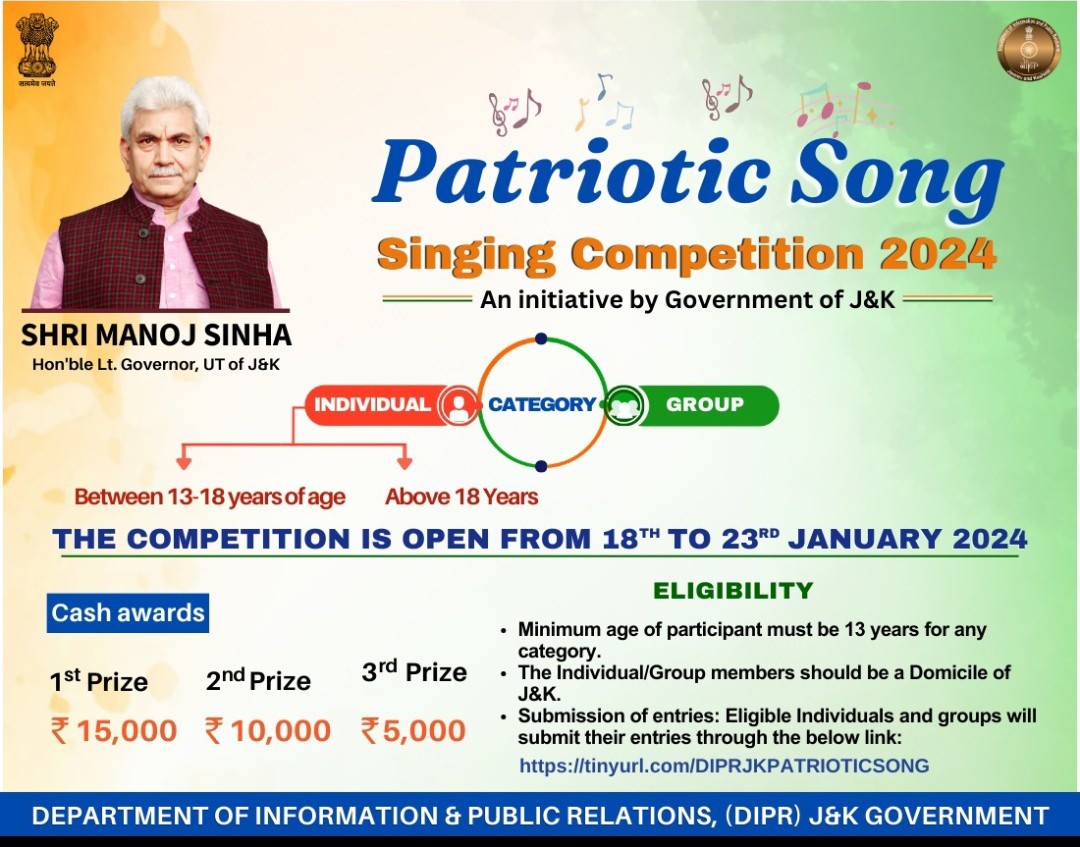 In anticipation of the upcoming #RepublicDay festivities, the J&K Government introduces the National Anthem Singing Competition 2023, offering cash prizes for the best entries. Submit your entries at: http://tinyurl.com/DIPRJKPATRIOTICSONG