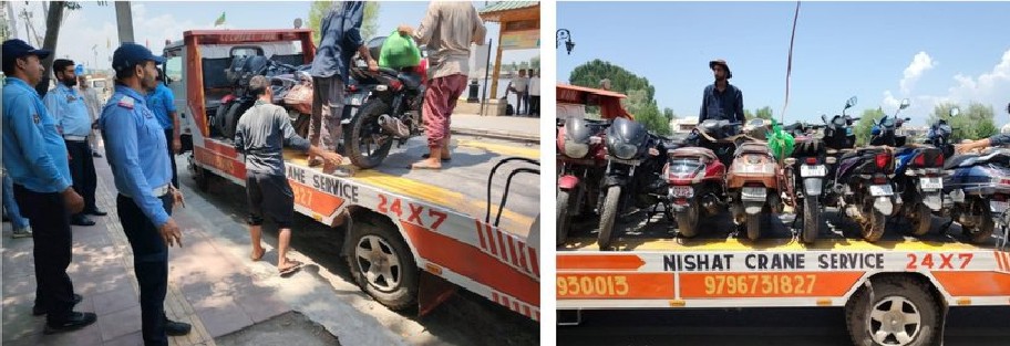 Srinagar, July 27: In a stringent move to ensure pedestrian safety and maintain order, Traffic police in Srinagar conducted a drive against two-wheeler owners who were illegally using footpaths for parking.