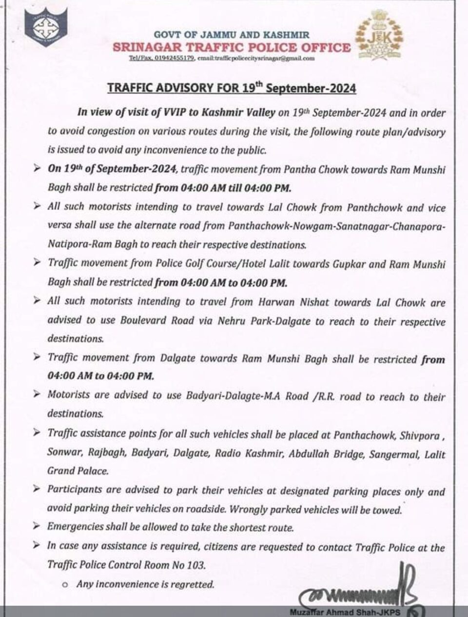 Srinagar, Sep 18 (KINS): Ahead of Prime Minister Narendra Modi’s scheduled visit to the Kashmir Valley on September 19, 2024, the Srinagar Traffic Police has issued a comprehensive traffic advisory to ensure smooth movement and avoid congestion on various routes.