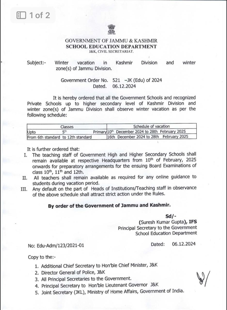 Srinagar, Dec 6 (KINS): The School Education Department of Jammu and Kashmir has announced the schedule for winter vacations for all government and recognized private schools up to the higher secondary level in Kashmir Division and the winter zone(s) of Jammu Division.