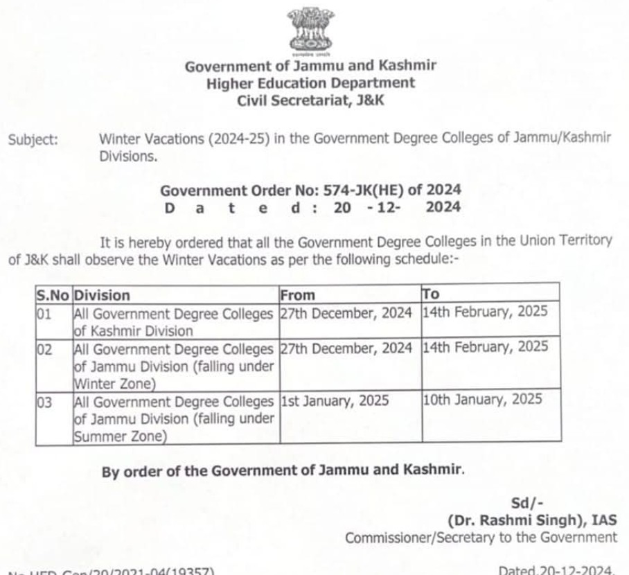 Srinagar, Dec 20 (KINS): The Government of Jammu and Kashmir has officially announced the winter vacation schedule for all Government Degree Colleges in the Union Territory for the academic year 2024-2025. According to a government order, issued by the Higher Education Department as per news gathering agency KINS, the winter break will be observed as follows: