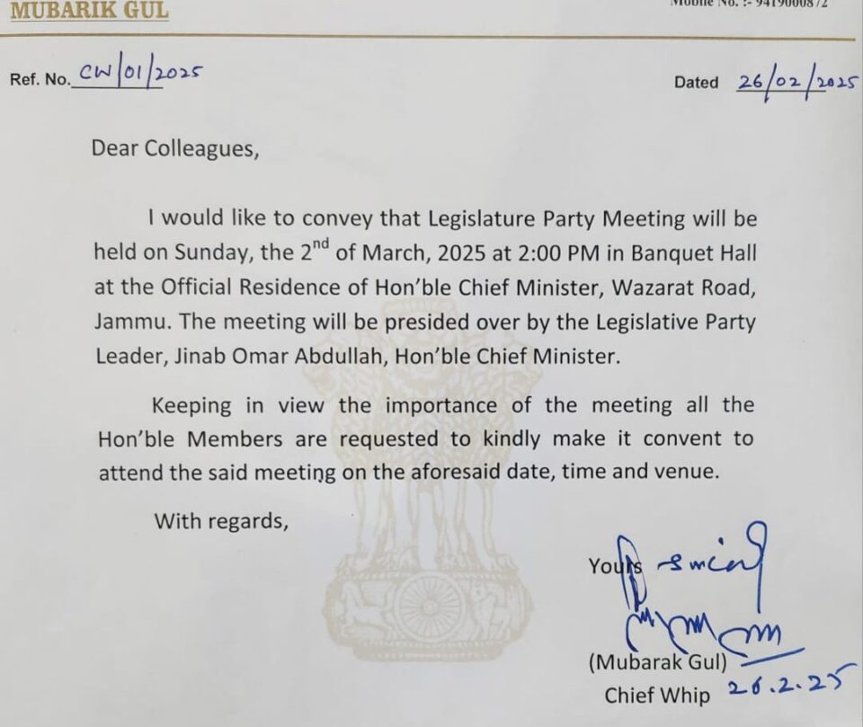 Mubarak Gul, the Chief Whip of the Jammu and Kashmir National Conference, in a communication announced that the meeting will take place at 2:00 PM in the Banquet Hall at the Official Residence of the Chief Minister on Wazarat Road, Jammu.