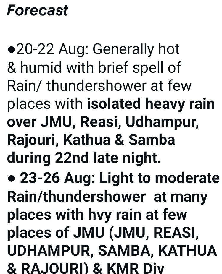 News agency KINS, quoted weather forecast, said that the weather from August 20 to 22 will remain generally hot and humid across the Union Territory, with brief spells of rain or thundershowers at a few places. Isolated heavy showers are expected in Jammu, Reasi, Udhampur, Rajouri, Kathua and Samba on the night of August 22.