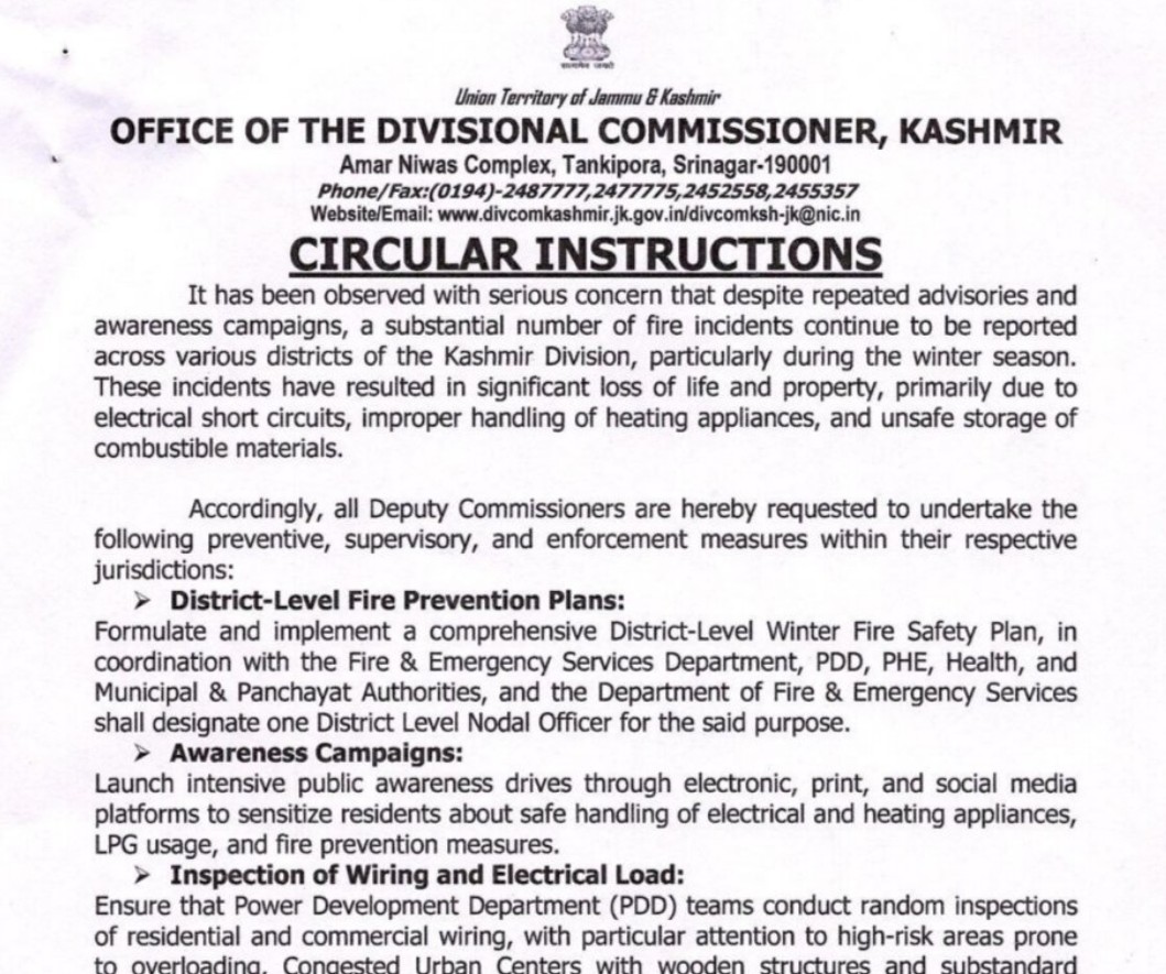 Srinagar, Oct 23 (KINS):The Office of the Divisional Commissioner, Kashmir, has issued stringent circular instructions to all Deputy Commissioners across the Kashmir Division, stressing the need for heightened fire safety measures ahead of the winter season. The directive comes in the wake of repeated fire incidents causing loss of life and property, primarily due to electrical short circuits, unsafe use of heating appliances, and improper storage of combustible materials.
