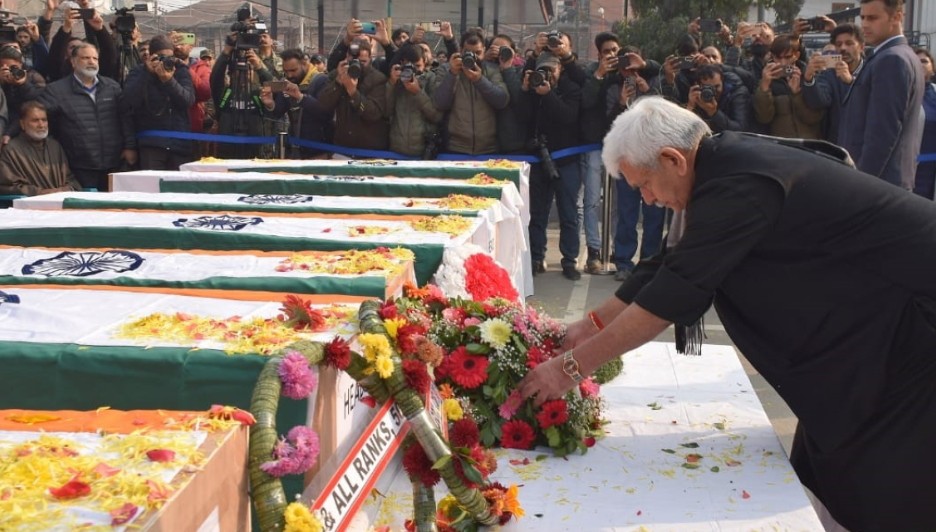 Srinagar, Nov 15 (KINS): Lieutenant Governor Manoj Sinha on Saturday laid a wreath and paid homage to the Police Personnel, Revenue Officials, and a civilian who lost their lives in the accidental blast at Nowgam Police Station late last night.