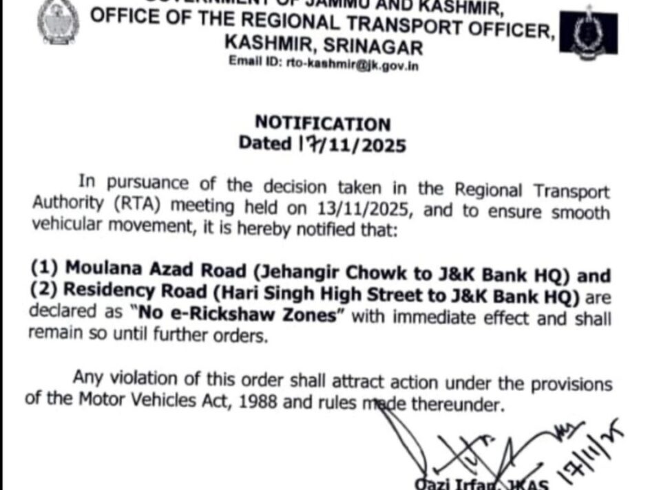 Srinagar, Nov 20 (KINS):The Regional Transport Office (RTO) Kashmir has issued a notification declaring two major stretches in Srinagar city as “No e-Rickshaw Zones” to ensure smooth traffic movement.