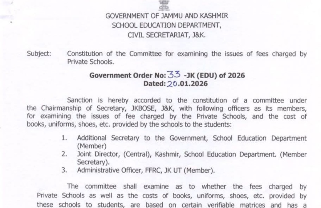 As per Government Order No. 33-JK (EDU) of 2026, issued by the School Education Department, the committee will be chaired by the Secretary, Jammu and Kashmir Board of School Education (JKBOSE). The panel has been tasked with reviewing whether the fees and other charges imposed by private schools are based on verifiable parameters and have a sound and justifiable basis.