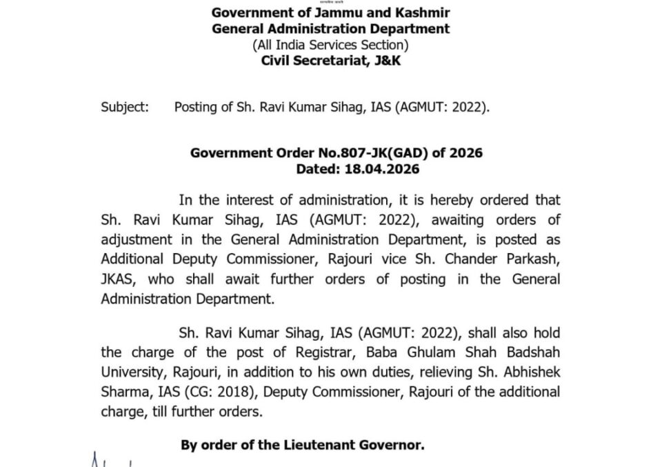 Jammu, Apr 18 (KINS): The Jammu and Kashmir Government on Saturday appointed Ravi Kumar Sihag as Additional Deputy Commissioner (ADC) Rajouri in the interest of administration. He replaces Chander Parkash, who has been directed to await further orders in the General Administration Department.