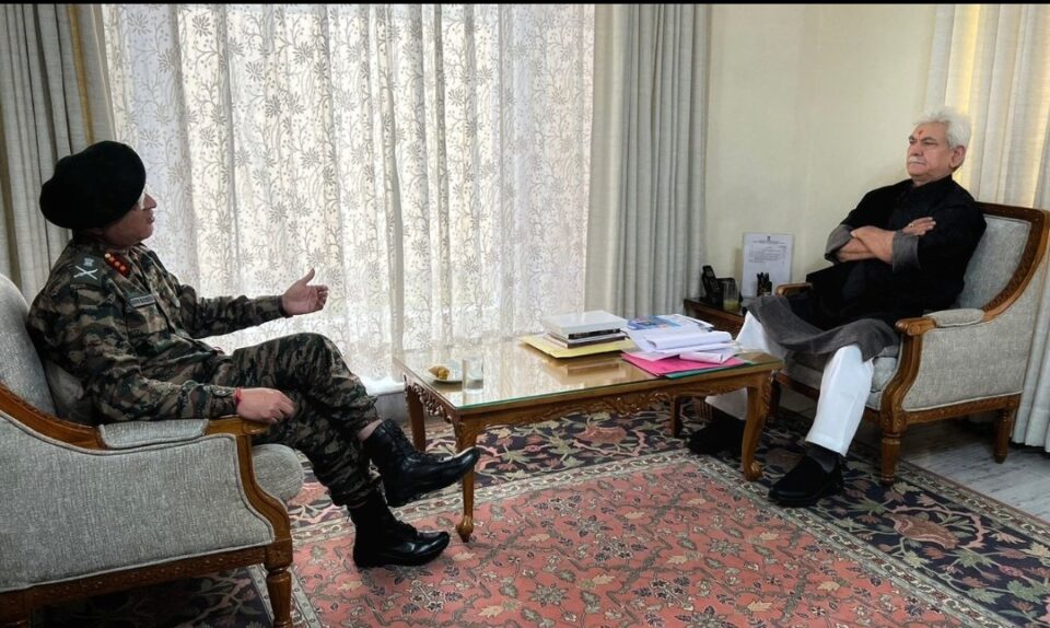 Srinagar, Jan 13: Lieutenant General Navin Sachdeva, the General Officer Commanding (GOC) of Whiteknight Corps, held a crucial meeting with Lieutenant Governor Manoj Sinha at Rajbhavan. The focus of the meeting revolved around a comprehensive discussion on the prevailing security situation.