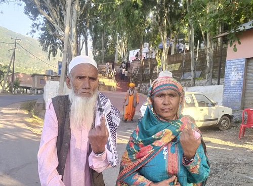 A 100-year-old Mala Begum cast her vote at the Pink Polling Station at Chattibandi in Bandipora and another elderly woman identified as Khatija, carried on shoulders by her son, cast her vote in the Uri assembly segment.