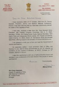 “I have received a letter from Dr. Farooq Abdullah dated October 11, 2024, informing that you have been unanimously elected as Leader of the Legislature Party,” Sinha stated in his official letter. He also mentioned letters from Congress leader Tariq Hameed Karra, CPI(M) Secretary G.N. Malik, AAP National Secretary Pankaj Kumar Gupta, and several independent MLAs offering their support to the new government.