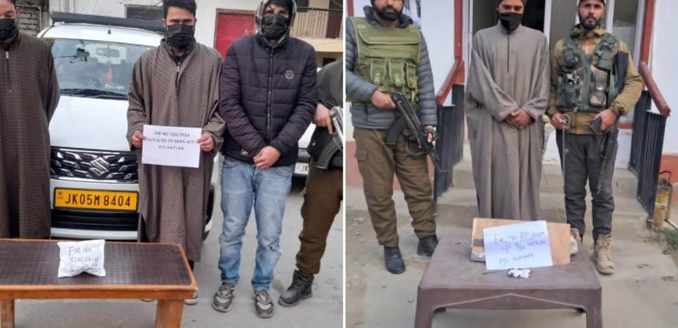 In Pulwama, a police party from Police Station Litter intercepted two suspicious persons at a checkpoint near Arihal Crossing. During the search, around 82 grams of a brown sugar-like substance was found. The individuals were identified as Nisar Ahmad Rather, son of Gulzar Ahmad Rather from Kanjipora Lajoora, and Fayaz Ahmad Bhat, son of Ghulam Qadir Bhat from Malangpora Pulwama.
