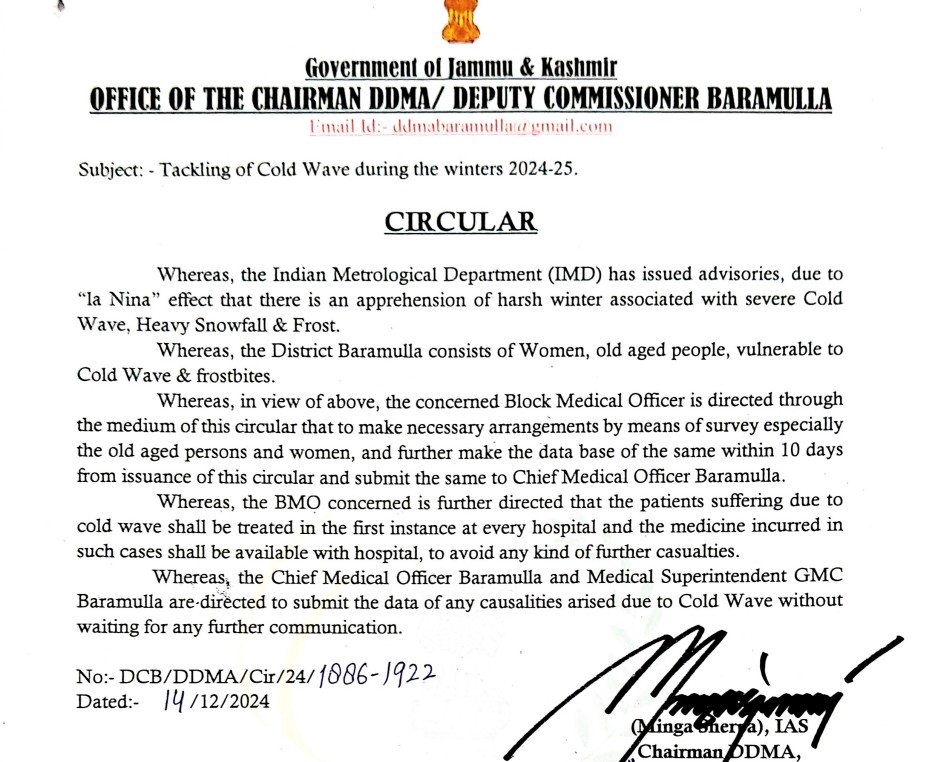 Furthermore, the Chief Medical Officer and the Medical Superintendent of Government Medical College (GMC) Baramulla have been instructed to report any deaths attributed to the cold wave immediately.