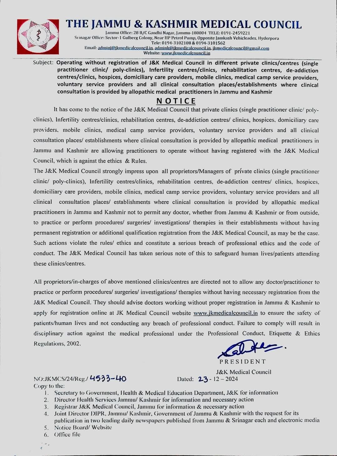 Srinagar, Dec 23 (KINS): The Jammu & Kashmir Medical Council has issued a stern notice to all private clinics, poly-clinics, infertility centres, rehabilitation centres, de-addiction centres, hospices, domiciliary care providers, mobile clinics, and other clinical establishments across Jammu and Kashmir, warning against the engagement of unregistered allopathic medical practitioners.