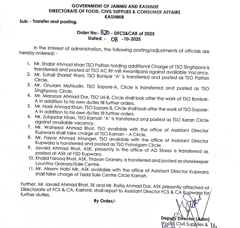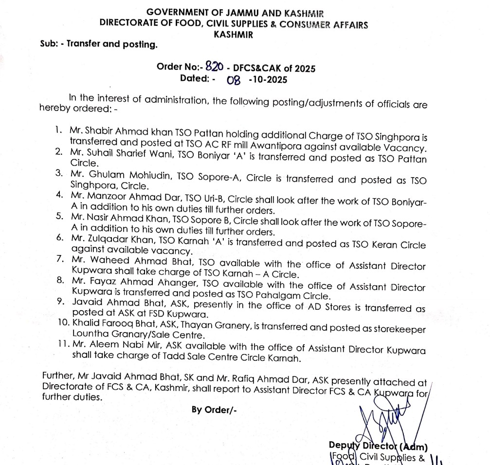 News agency Kashmir Indepth News Service (KINS) reported that as per Order No. 820-DFCS&CAK of 2025, dated 08 October 2025, the reshuffle has been carried out in the interest of administration, covering key circles in Baramulla, Kupwara, Pattan, Sopore, Uri, Karnah, Keran, and Pahalgam.