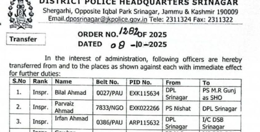 Inspector Irfan Ahmad has been shifted from DPL Srinagar and will now serve as I/C DSB Srinagar.