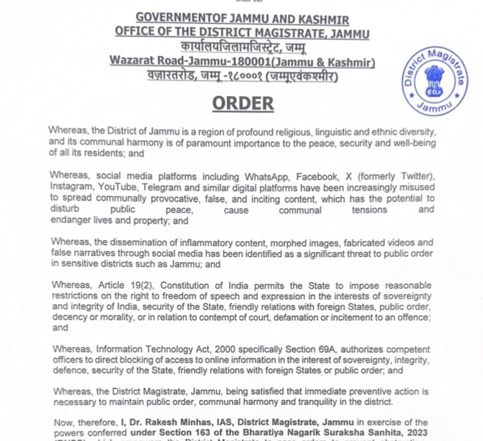 The order, as per news agency Kashmir Indepth News Service (KINS) comes amid concerns over the misuse of platforms such as WhatsApp, Facebook, X, Instagram, YouTube and Telegram for spreading false, provocative and communal material capable of disturbing public peace and harmony.